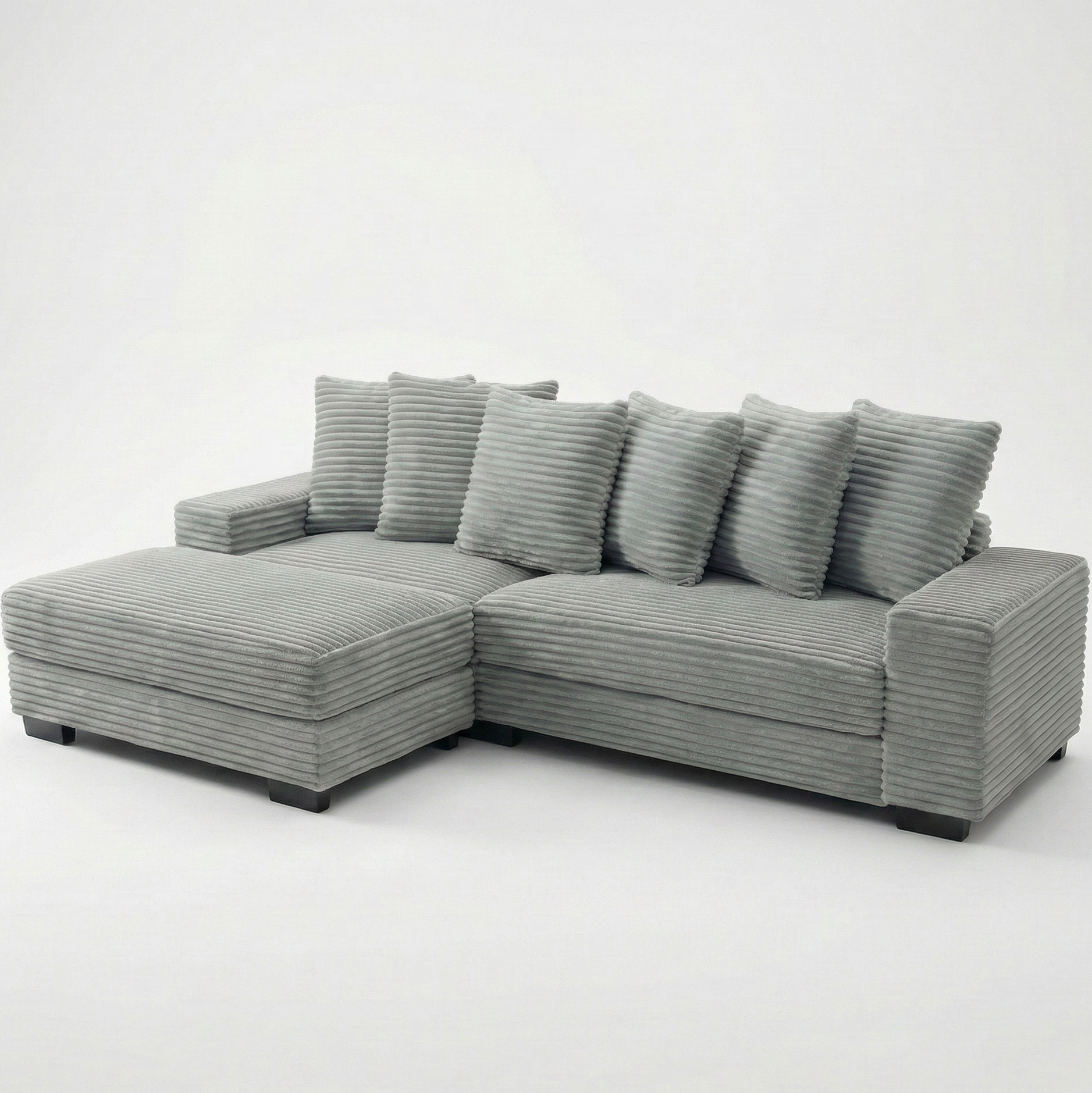 Canapé d'angle convertible avec revêtement en tissu velours côtelé gris à larges côtes. Structure composée d'un manchot et d'une méridienne, formant une assise en L. Le dossier est assuré par 6 coussins amovibles indépendants de forme carrée, garnis de la même étoffe. Accoudoirs pleins de forme cubique, surface plane. Le canapé repose sur des pieds blocs bas de coloris noir/sombre.